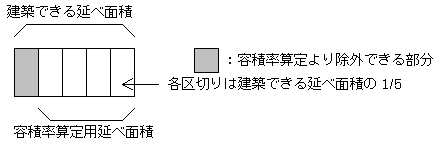 注1)上記緩和の条例は自動車車庫等の床面積の限度ではありません。従って1/5を超えた場合は超えた部分の床面積を容積率算定用延べ面積に算入しなければなりません。